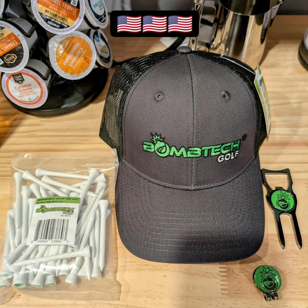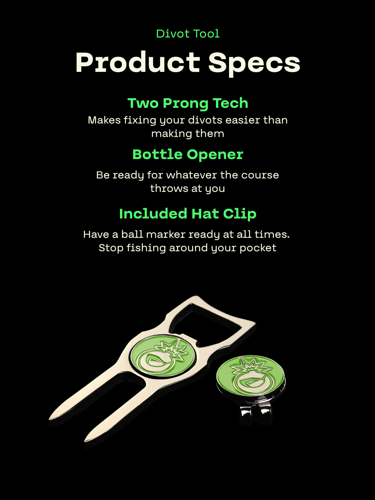 Keep your local greens pristine and your game flowing with the BombTech Divot Tool and Hat Clip Ball Marker! This essential tool makes fixing divots quick and easy, and did we mention it can open your ice cold beverage?!