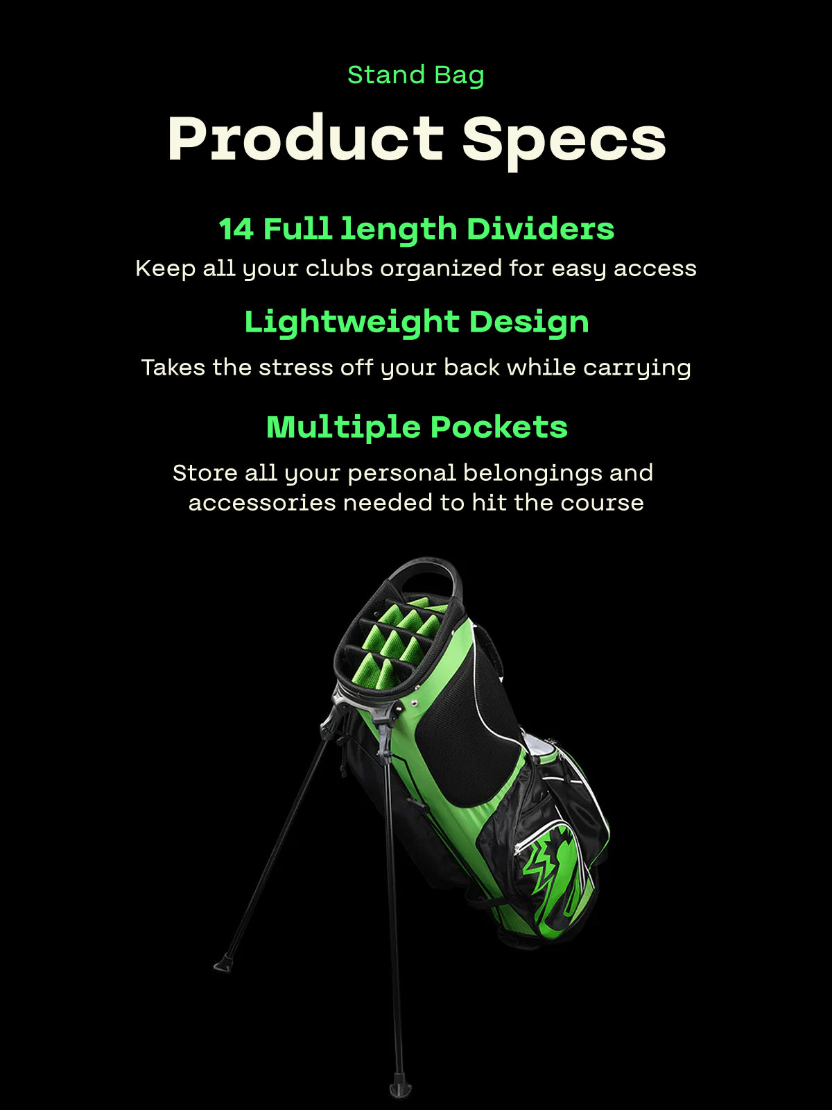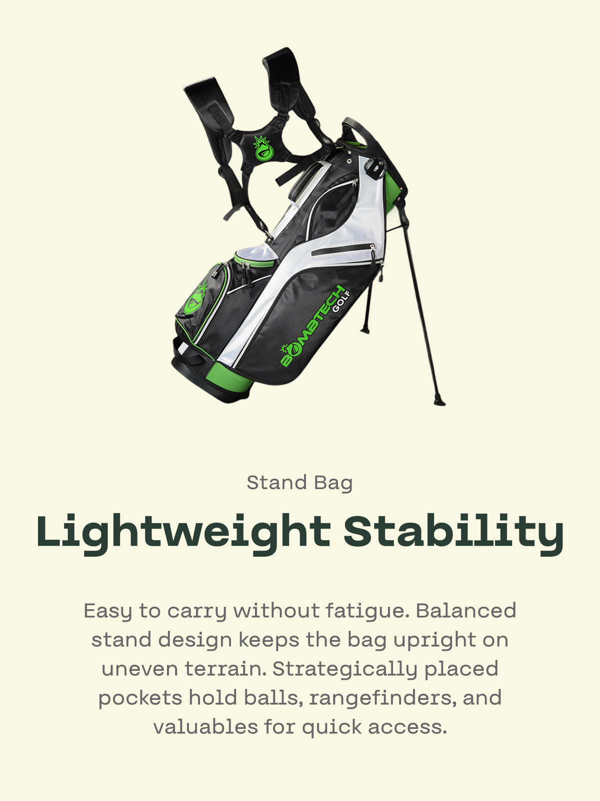 If you’ve ever seen a Bomb Tech ad, you have seen one of my comments raving about BT’s clubs (seriously I get accused of being a paid commenter once a week!)! They really elevated my game, and made it affordable for me to have a quality set and fall in love with the game even more… when it was time for a new bag, there was no way I could go with anything other than this one and tbh I couldn’t be happier! It’s high quality, light weight, durable… I love the kick stand! Tons of pockets and storage.plus the green and black pops on the course! My only criticism is that although it has a little drink pouch (big enough for one, possible 2 beers), it would really be great if it had a built in cooler. Thank you for your service and for growing the game of golf!