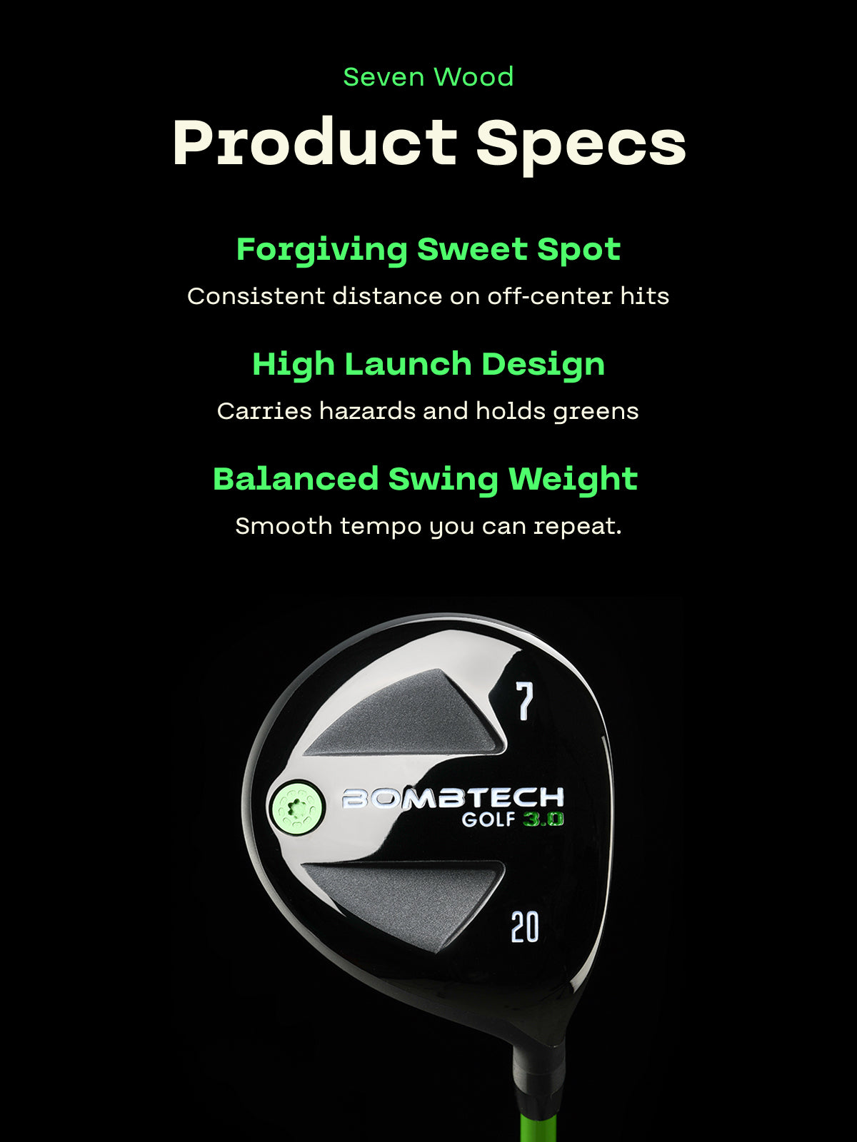 The new limited edition BombTech 3.0 seven wood was one of our most requested products ever. The 7 wood was designed with strategic weight placements that will get your ball flying high and fast from any lie. Bomb your new seven wood off the deck, off the fairway, or even out of the rough.