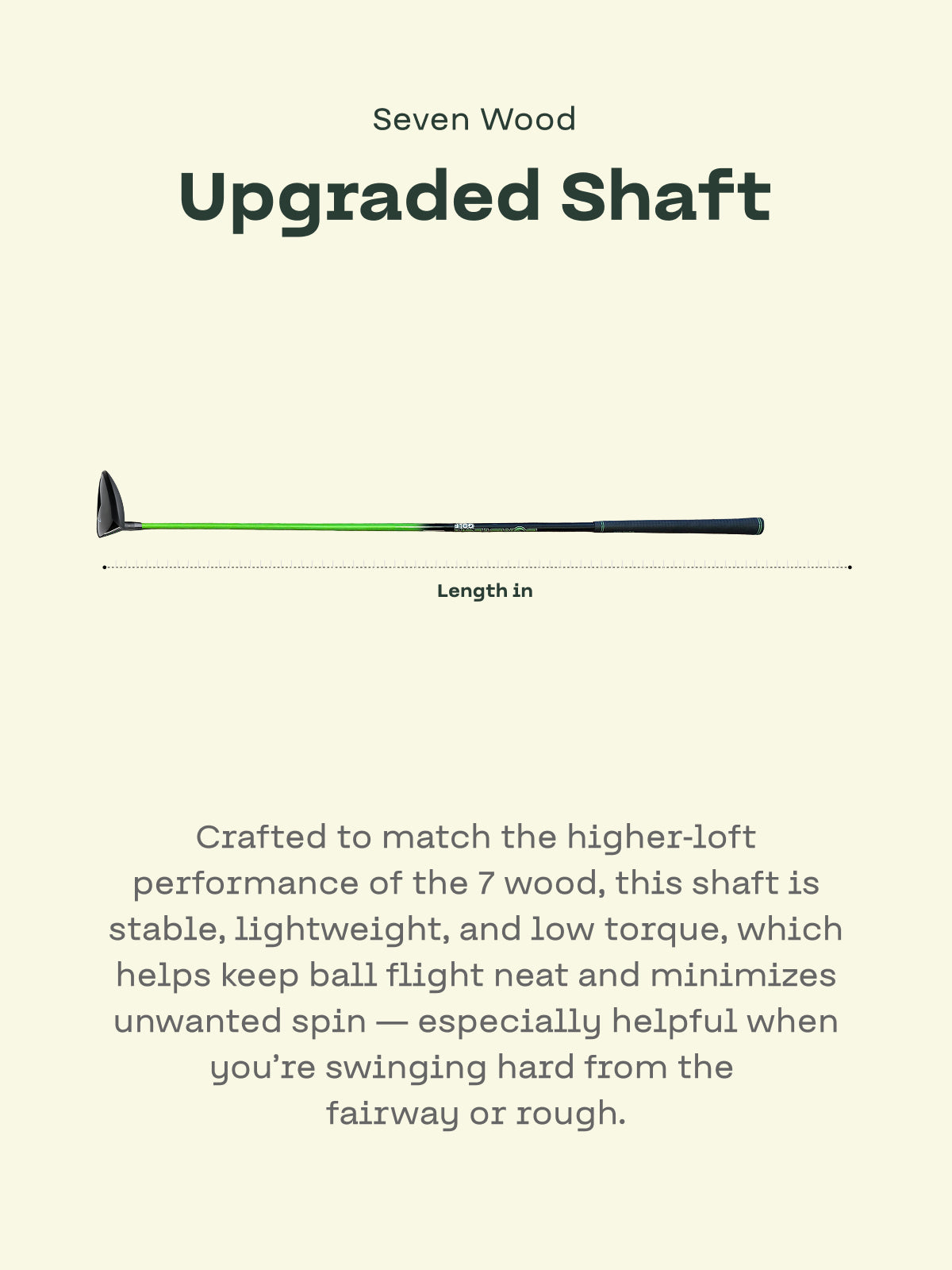 Our new 7 wood shaft is more stable, lighter, and lower torque. We made sure that our new shaft would truly be worthy of that premium title. I am confident that our new shaft setup will give you more confidence when you are swinging hard and on your mishits. No need to upgrade when your stock shaft already is!
