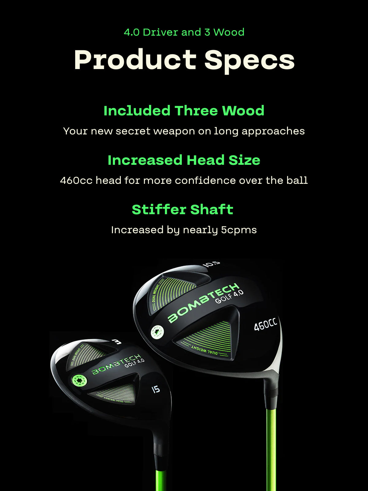 We designed the 4.0 driver to be bigger at 460cc versus 450cc to give you even more confidence when stepping up to the tee. We strategically moved the heel and toe weights to be internal to further improve sound and feel. And lastly, we made the shaft stiffer by nearly 5cpms. The end result is a BIGGER, STIFFER driver that for us has reduced our mishits and lowered spin. The big hooks and slices that we once feared are greatly reduced with the shaft upgrade and confidence-inspiring head size.